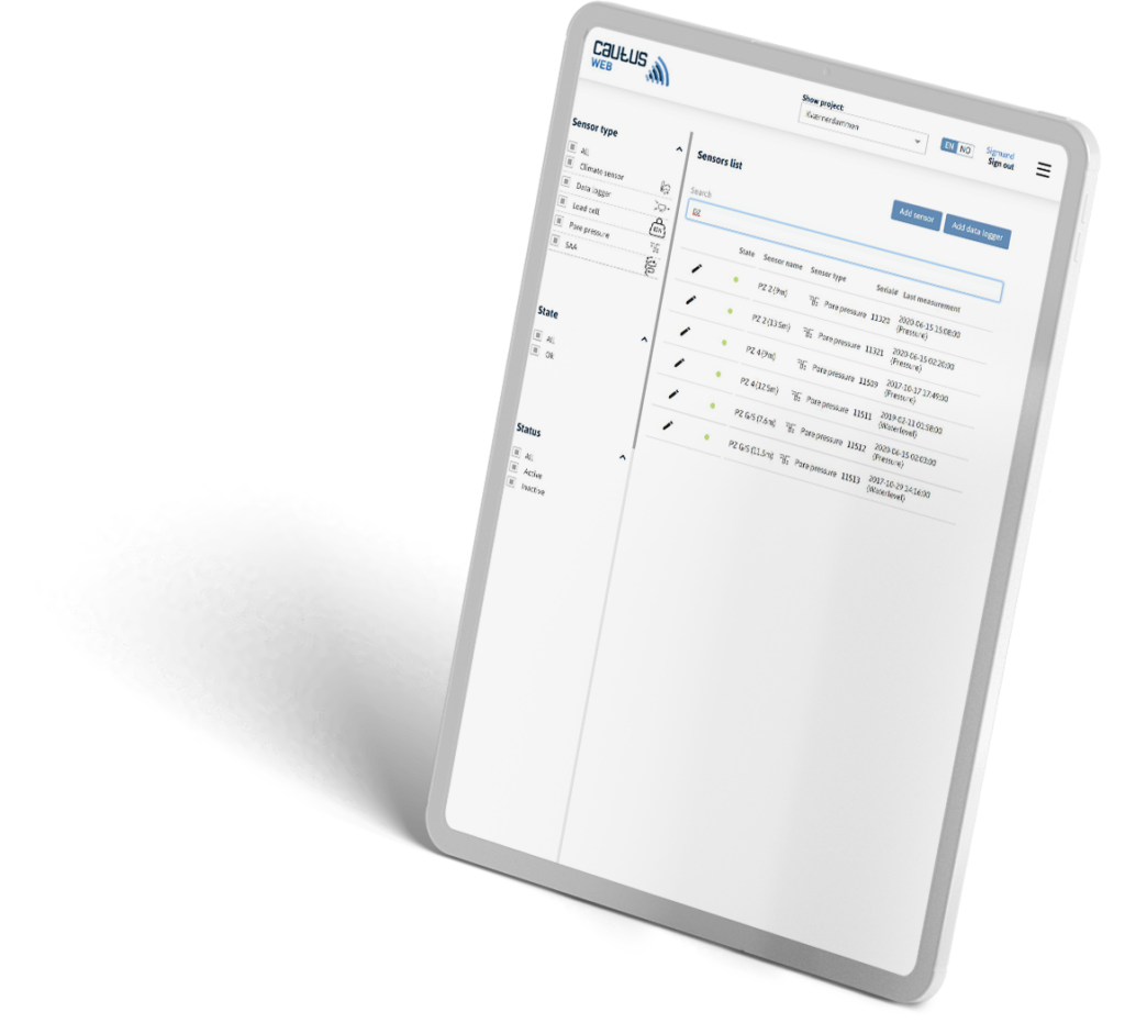 Cautus Web er en skyløsning for behandling og presentasjon av data fra en rekke sensorer og målesystemer. Systemet er uavhengig av sensorprodusentene og tilbyr en komplett løsning for sanntidsovervåking.
