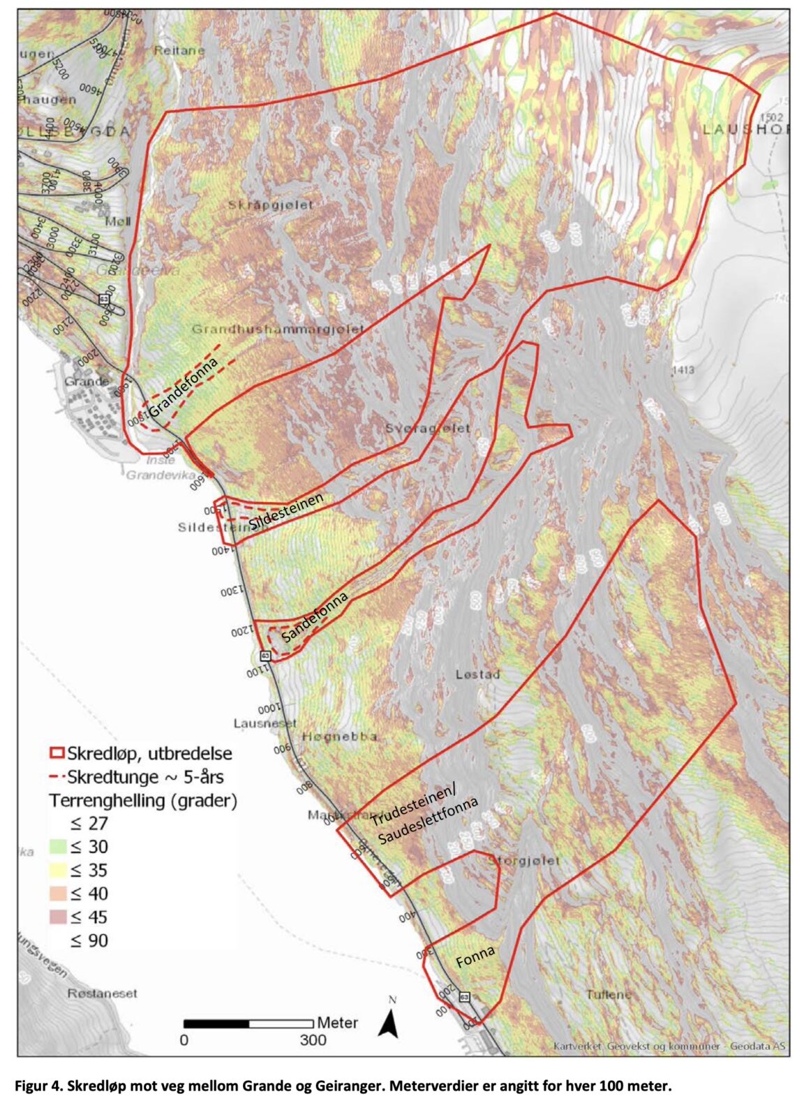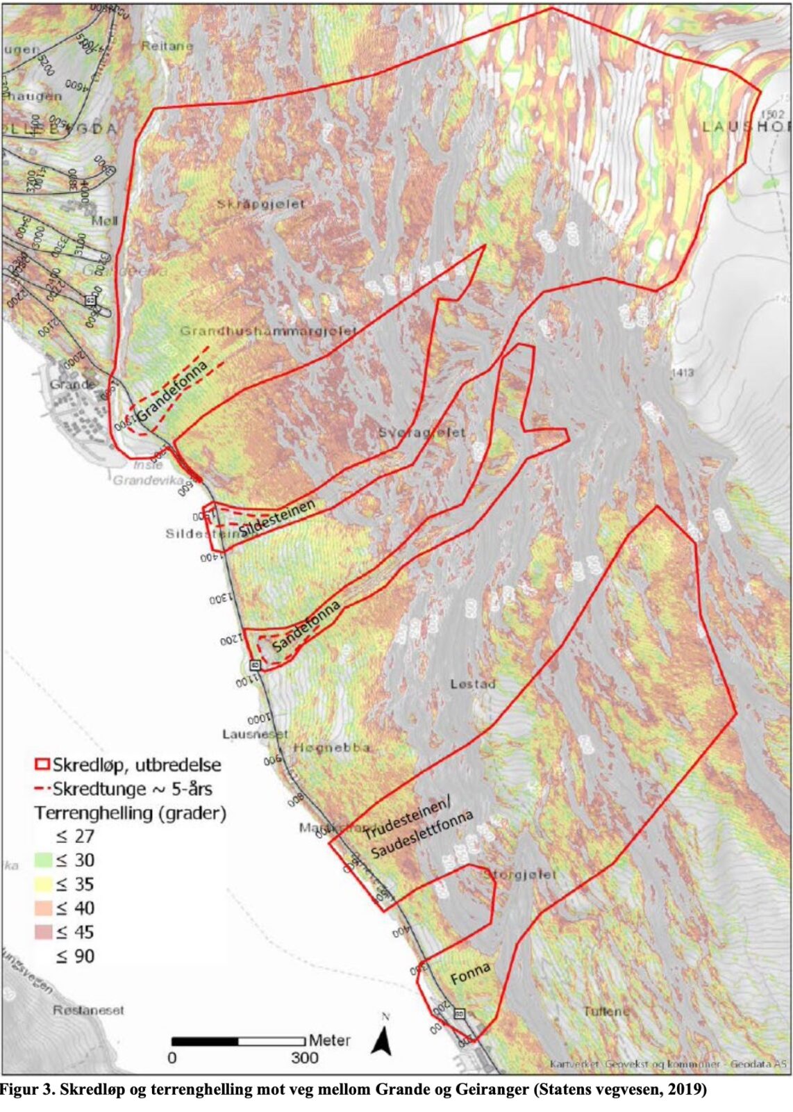 Grandefonna og Sildesteinen heter skredpunktene som truer fylkesvei 63, Ørneveien fra Grande til Geiranger. De siste 20 årene har det gått 16 snøskred. Veien er blitt stengt forebyggende ved fare for skred.