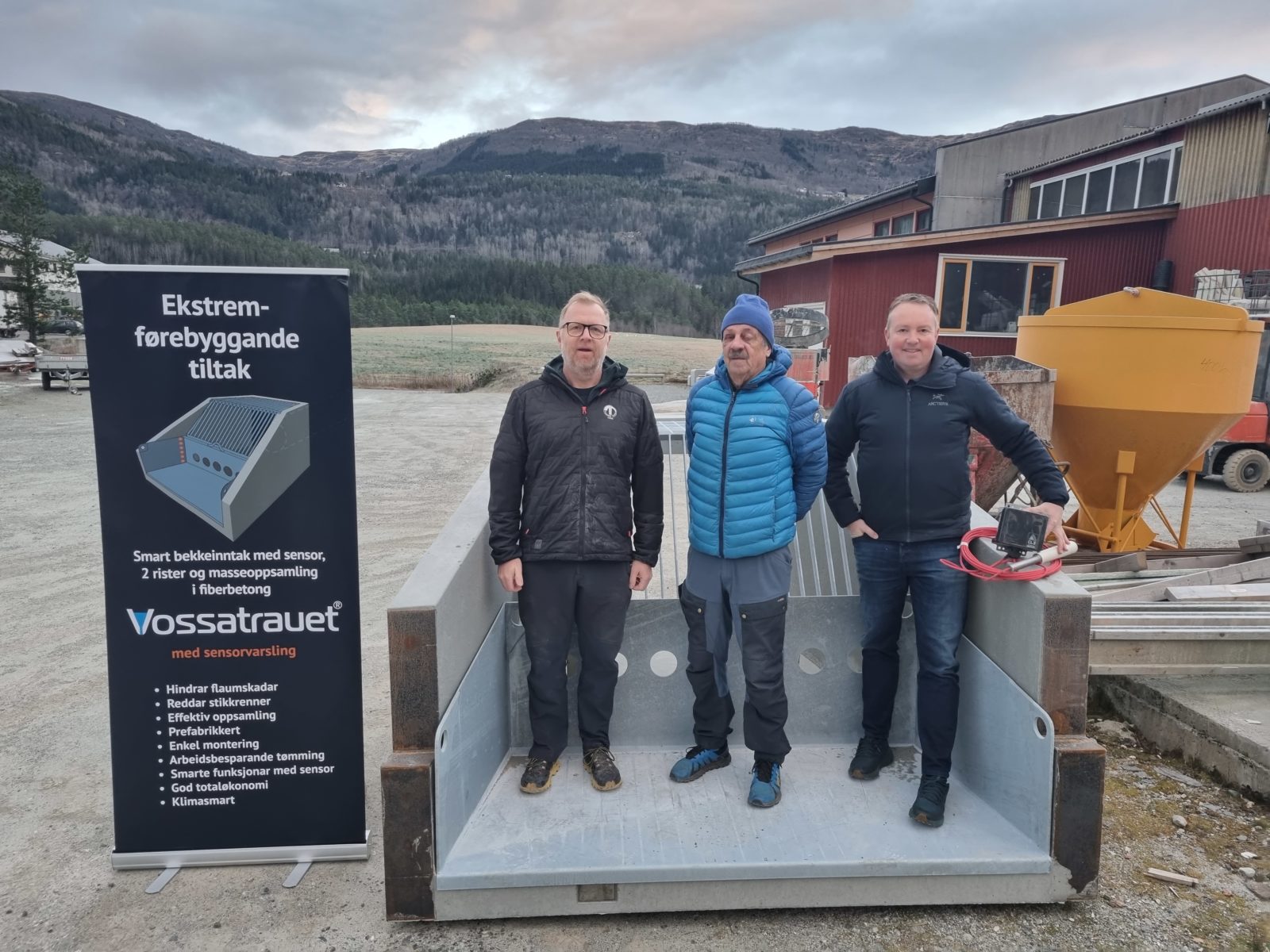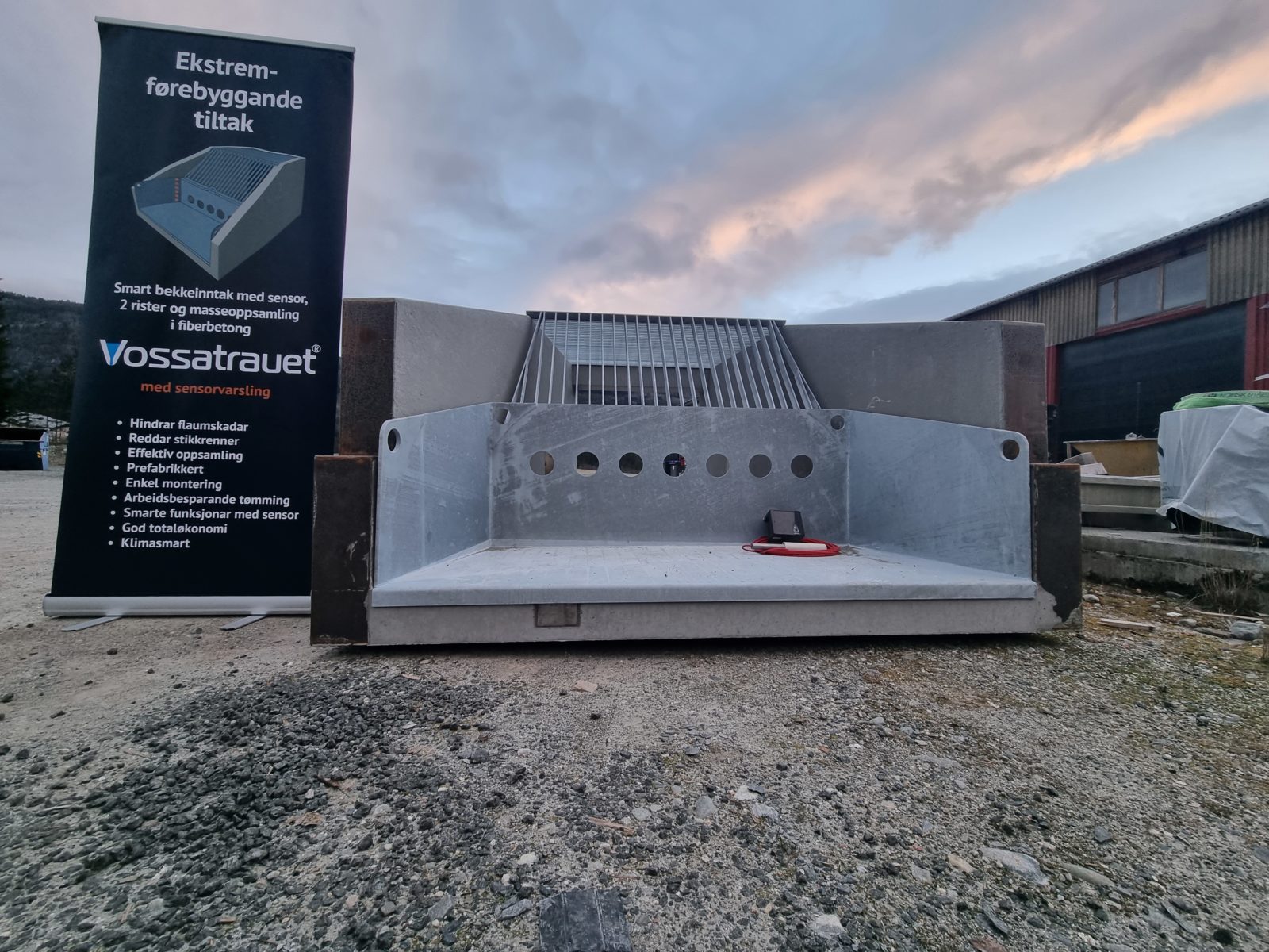 – Den kan heises opp, tømmes og settes tilbake med enkle grep. Sånn har løsningen vært i 20 år. Nå er den også blitt smart. Det betyr at bekkeinntak og stikkrenner kontinuerlig overvåkes og selv varsler når det er behov for opprenskning, sier Rune Skjoldal i betongprodusenten Tunge Ting på Voss. Det er de som produserer trauene.